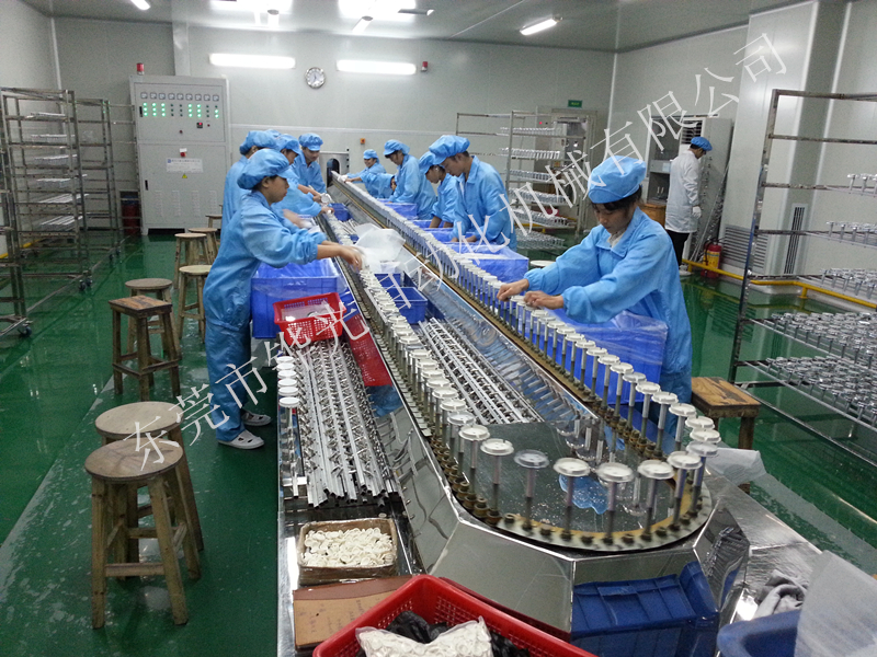 操作者在工作臺面的上料區手工將半成品瓶蓋,瓶子等工件套在夾具上,通過輸送傳動鏈依次通過生產線的各個功能部件。